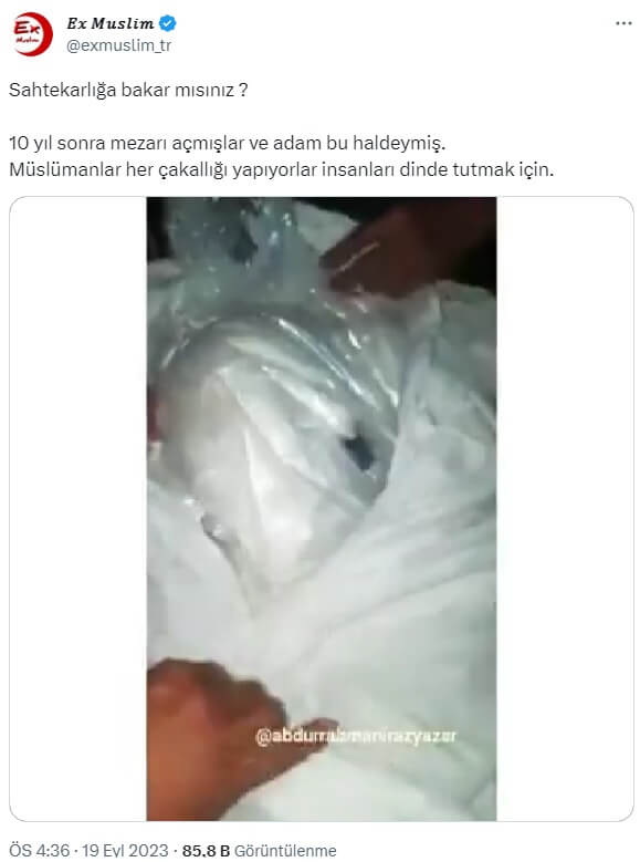Ex Muslim (@exmuslim_tr): “Sahtekarlığa bakar mısınız ? 10 yıl sonra mezarı açmışlar ve adam bu haldeymiş. Müslümanlar her çakallığı yapıyorlar insanları dinde tutmak için.”