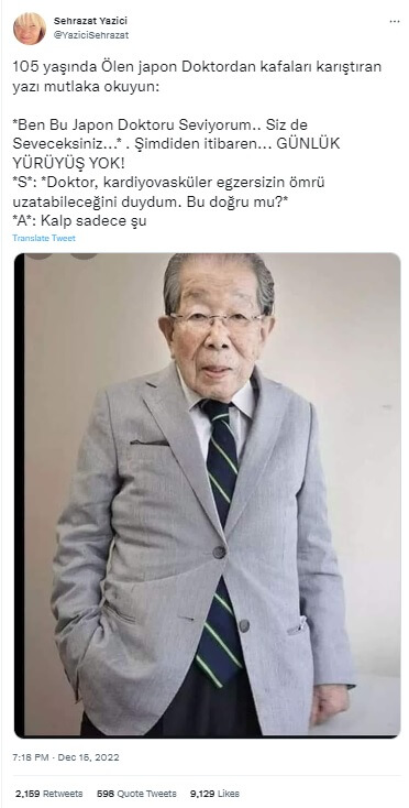 “105 yaşında ölen Japon Doktordan kafaları karıştıran yazı mutlaka okuyun” çağrısıyla (Şehrazat Yazıcı gibi kullanıcılar tarafından) sosyal medyada paylaşılan metin şöyle: