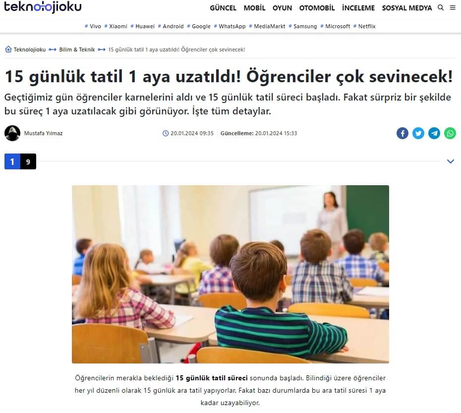 Teknolojioku.com’un uydurduğu iddia “MEB Personel” adlı internet sitesi tarafından “Öğrenciler tatile doyacak! 15 günlük tatil 1 aya uzatıldı” başlığıyla duyurulmasıyla yaygınlık kazandı.