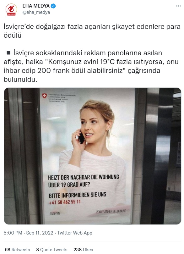 “Rusya Ukrayna savaşıyla birlikte Avrupa’da yaşanan enerji krizi nedeniyle birçok ülke yaklaşan kış öncesi bir dizi önlem alıyor. Son olarak İsviçre sokaklarındaki reklam panolarına asılan afişte, halka “Komşunuz evini 19 dereceden fazla ısıtıyorsa, onu ihbar edip 200 frank ödül alabilirsiniz” çağrısında bulunuldu.”