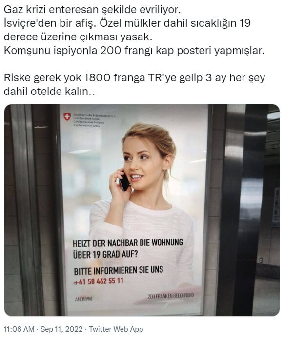 “Gaz krizi enteresan şekilde evriliyor. İsviçre’den bir afiş. Özel mülkler dahil sıcaklığın 19 derece üzerine çıkması yasak. Komşunu ispiyonla 200 frangı kap posteri yapmışlar.”