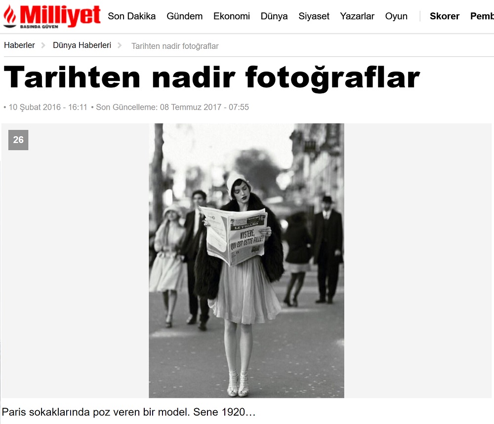 Milliyet Gazetesi internet sitesinde yayınladığı “Tarihten nadir fotoğraflar” başlıklı fotoğraf galerisinde bahse konu fotoğrafı “Paris sokaklarında poz veren bir model. Sene 1920…” notuyla sunmuştu.