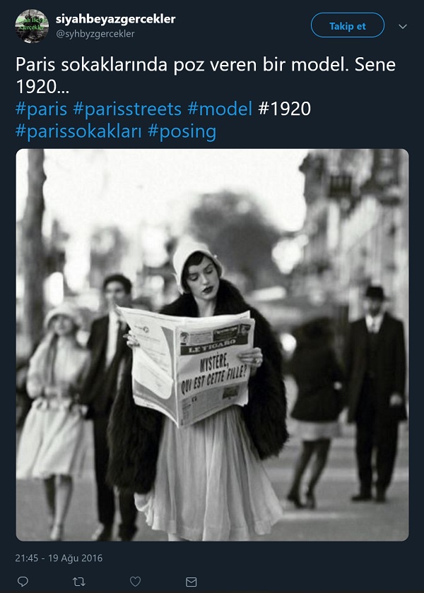 Milliyet’in fotogalerisinde “Paris sokaklarında poz veren bir model. Sene 1920…” notuyla bahse konu fotoğrafın sunulduğu görülüyor
