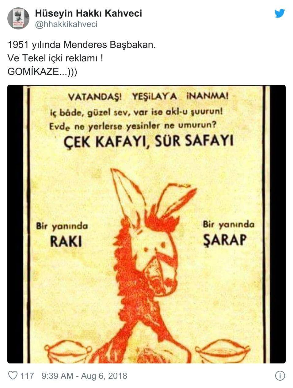 Medyasiyaset.com gibi sitelerde köşe yazıları yayımlanan Hüseyin Hakkı Kahveci, sosyal medya hesabından yaptığı bahse konu görseli “1951 yılında Menderes Başbakan. Ve Tekel içki reklamı ! GOMİKAZE…)))” notuyla Tekel reklâmı olduğunu sanarak paylaşmıştı.
