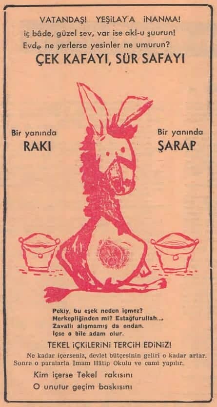 “Bir yanında rakı”, “bir yanında şarap” yer alan eşeğin merkezinde yer aldığı ilânda şu ifadelerin yer aldığı görülmektedir:
