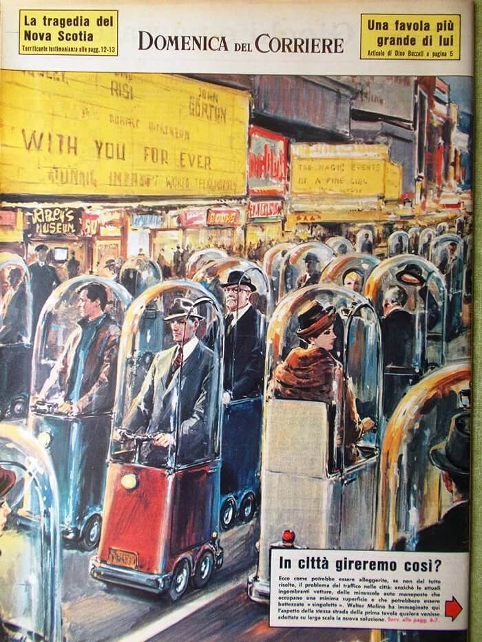 New York’taki bir caddede yaşanan trafik sorununu gösteren resimde aslında şehirlerdeki trafik sorununun gelecekte daha az yer kaplayan küçük, biniciyi hava koşullarından korumak için kubbe biçimli camla kaplı dört tekerlekli bir scootera benzer tek kişilik araçlar kullanarak nasıl hafifletilebileceğini göstermektedir.