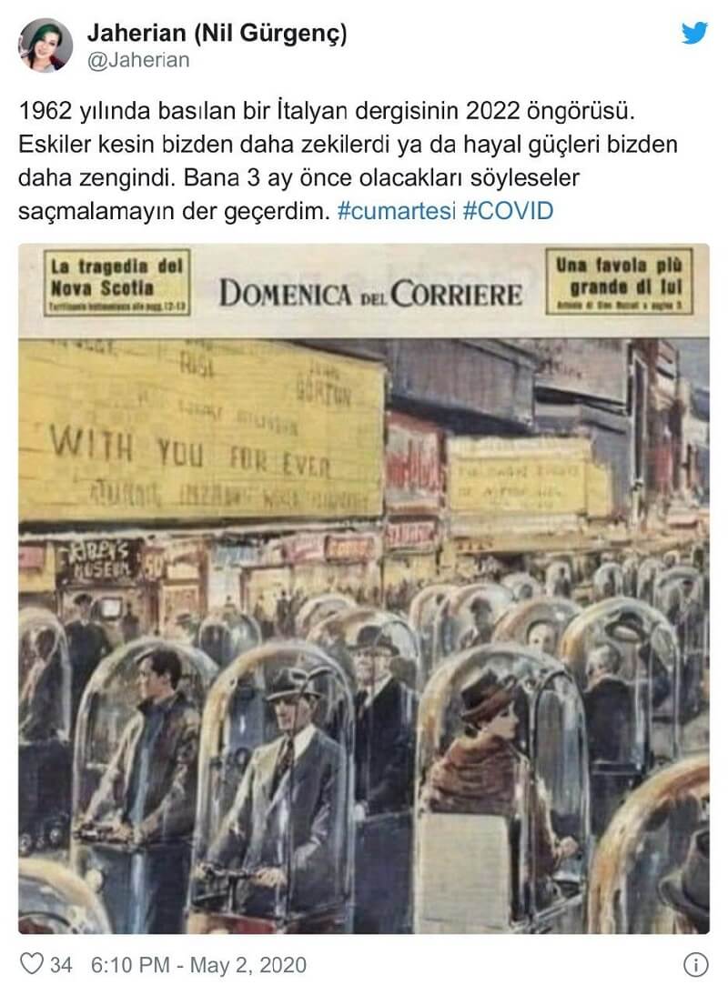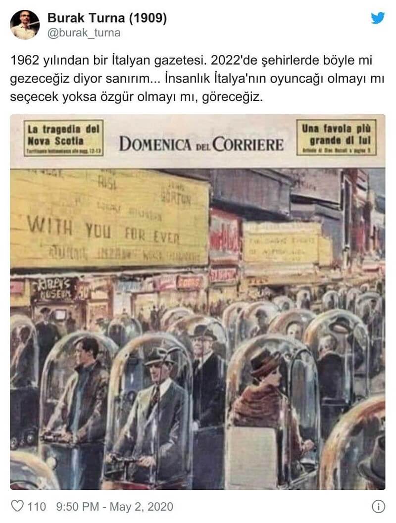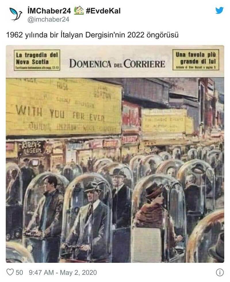 Koronavirüs salgınının (Covid-19) patlak vermesinden bu yana salgının ya da gelecekte etkileyeceği yaşam biçimlerinin geçmişte öngörüldüğüne yönelik birçok iddia dolaşıma girdi. 1962 yılında İtalya’da yayımlanan bir derginin 2022 yılında salgının etkisiyle izole yaşam biçimini resmettiğine dair iddia da bunlardan biri.