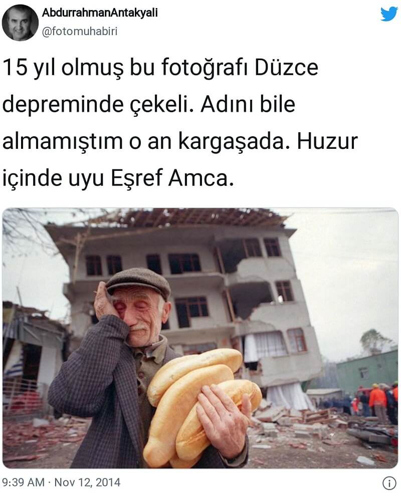 “Çevrede ne olup bittiğini anlamaya çalışıyorum. Baktım ki yaşlı bir amca, sol koluyla kavradığı ekmeklerle, sağ eliyle gözyaşlarını silerek bulunduğum tarafa doğru geliyor. Hızlıca ona doğru koştum. Arkasındaki beton yıkıntısıyla birlikte çekmeyi düşündüm. Fotoğrafa hem felaketin boyutunu gösteren hem de insan unsurunu da katmak istedim… Amca ağlıyordu. Hemen deklanşöre bastım ve seri olarak 8-10 kare fotoğrafını çektim…”