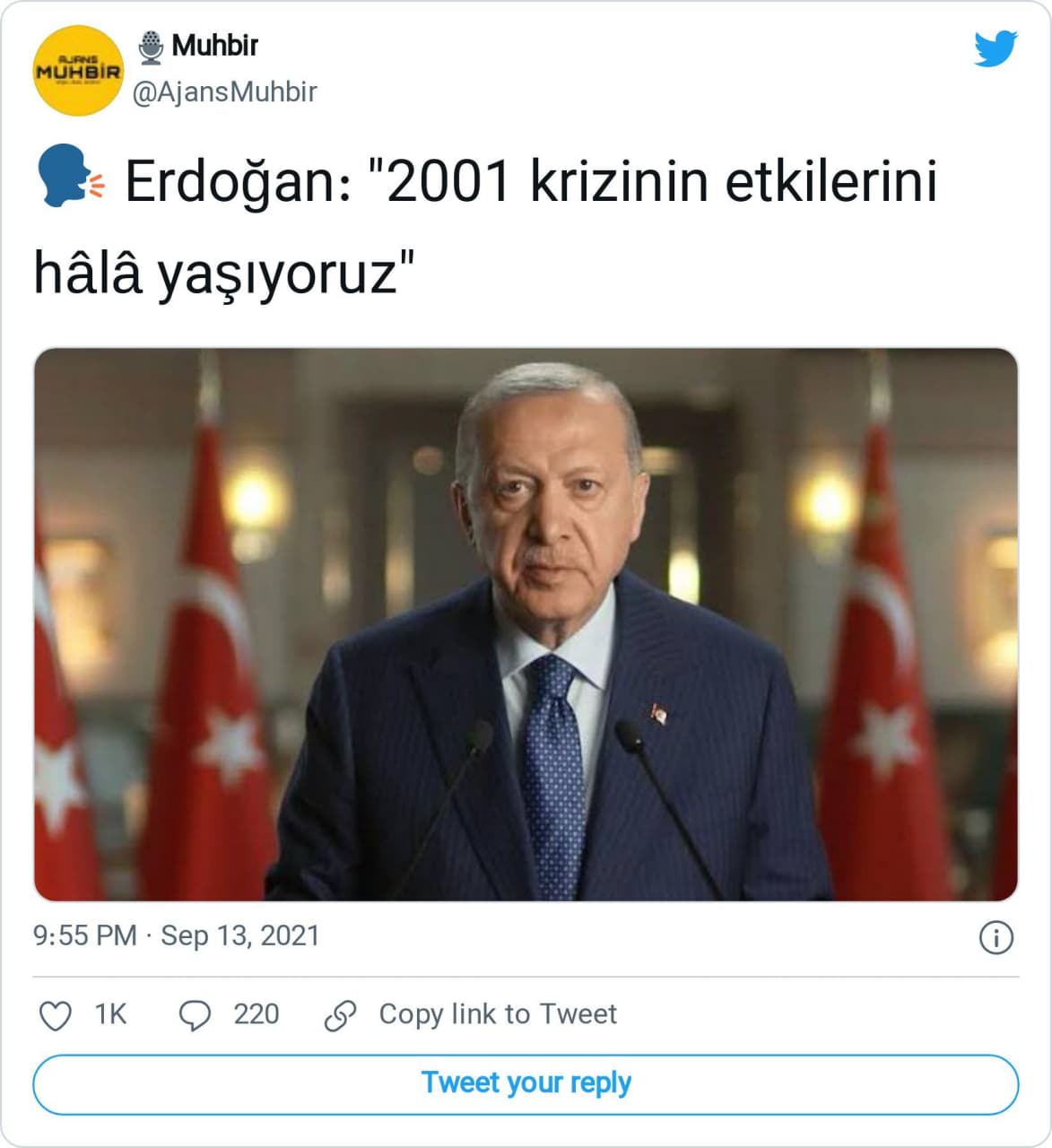 Ancak bu aktarımın aksine Cumhurbaşkanı Erdoğan, 13 Eylül 2021 tarihinde Şişecam Polatlı Yeni Üretim Hattı’nın açılışında yaptığı konuşmada 2001 krizinin etkilerinin günümüzde hâlâ devam ettiğini söylememiş. Erdoğan’ın konuşmasında 2001 krizinin etkilerinin hissedildiği dönem ile ilgili atfı günümüze yönelik değil, AK Parti’nin göreve 2002 yılında geldiği ilk döneme dair.