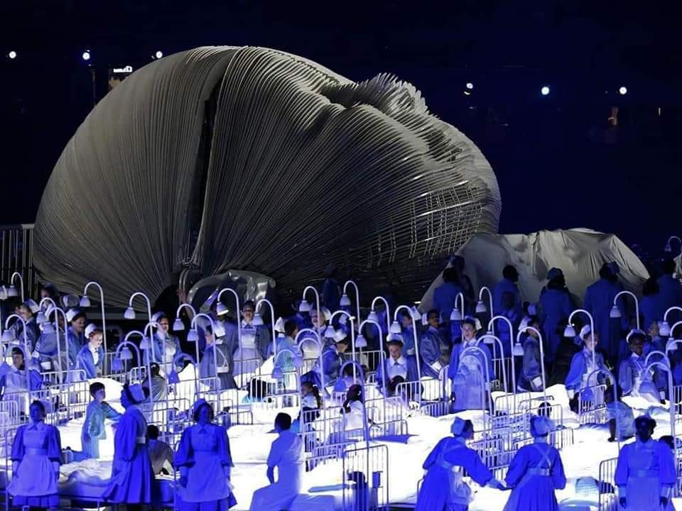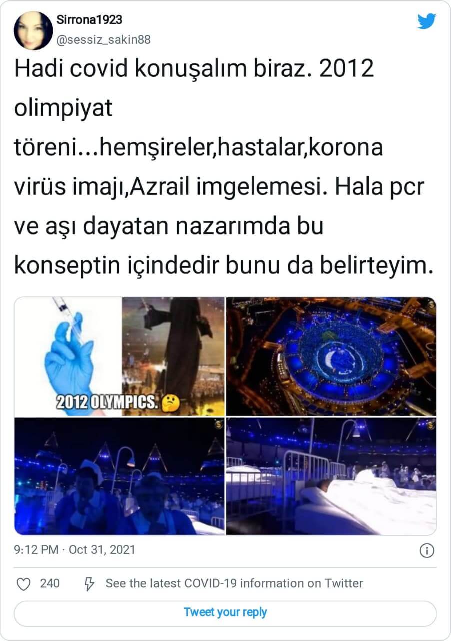 “Hadi covid konuşalım biraz. 2012 olimpiyat töreni…hemşireler, hastalar, korona virüs imajı, Azrail imgelemesi. Hala pcr ve aşı dayatan nazarımda bu konseptin içindedir bunu da belirteyim.