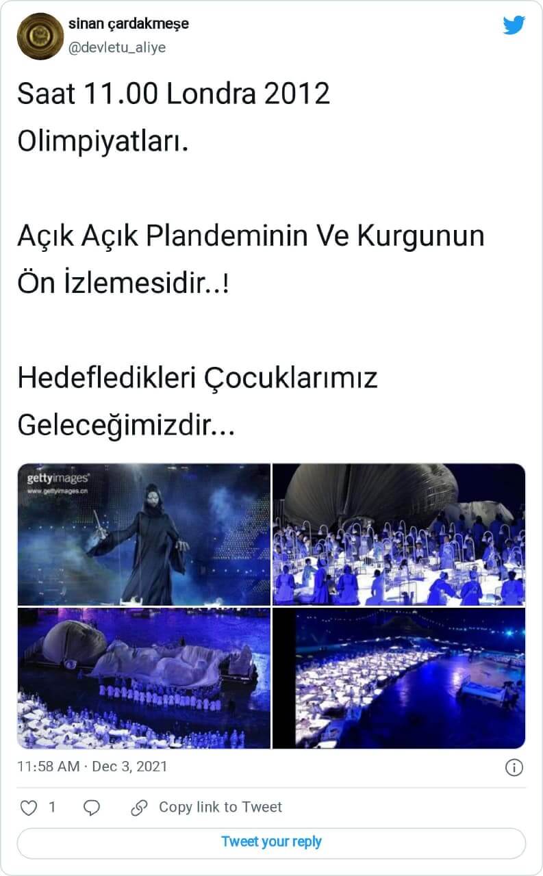 Büyük resim görme sevdalısı pandemi septik sosyal medya kullanıcılarının son iddialarından biri, 2020 yılı Aralık ayında ilk izleri görülen koronavirüs pandemisinin (Covid-19) yıllar öncesinde işaretlerinin Londra 2012 Olimpiyat Oyunları açılış töreninde gizlendiği yönündeydi.