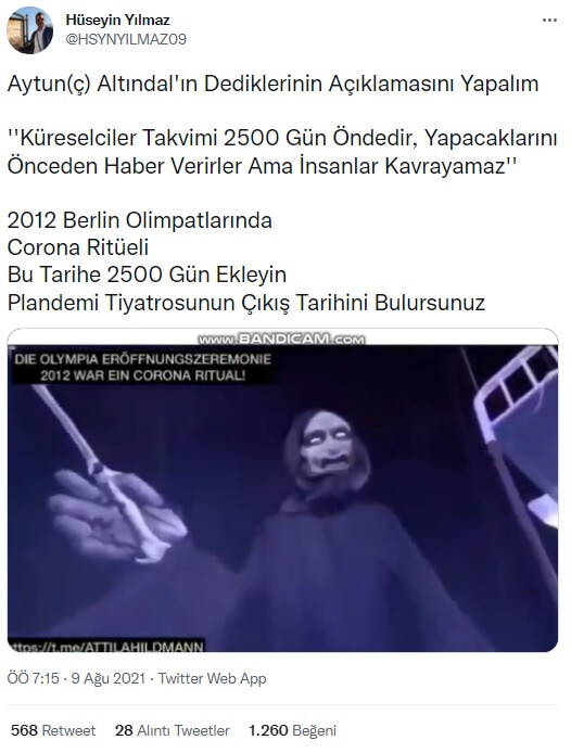“Aytun(ç) Altındal’ın Dediklerinin Açıklamasını Yapalım ”Küreselciler Takvimi 2500 Gün Öndedir, Yapacaklarını Önceden Haber Verirler Ama İnsanlar Kavrayamaz” 2012 Berlin Olimpatlarında Corona Ritüeli Bu Tarihe 2500 Gün Ekleyin Plandemi Tiyatrosunun Çıkış Tarihini Bulursunuz”
