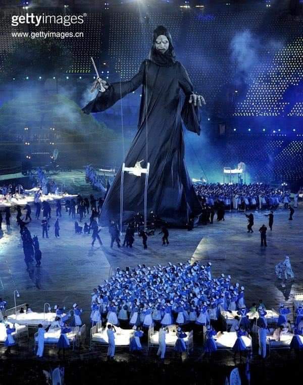 2012 Londra olimpiyatları açılış töreninde İngiliz Sağlık Sisteminin (NHS) tarihini anlatan bir koreografi yapılır. Üzerinde çocukların yattığı yüzlerce hastane yatağının sahneye getirildiği, mikropların çocukları kovaladığı, tuhaf dijitalimsi bebek resimlerinin sahnede belirdiği, stadyumun ortasında sözde “Azrail” görünümlü bir devin yükselerek çubuğundan etrafa bir şeyler saçtığı, benzerlerini bugün korona tedavi hastanelerinde gördüğümüz sağlık çalışanlarının tuhaf danslarını burada anlatmaya sütunumuzun yeterli olmayacaktır.