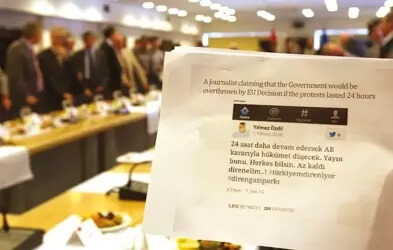 Dönemin AB Bakanlığında farklı ülkelerin büyükelçilerine yapılan Gezi Parkı Eylemleri hakkındaki sunumda kendisine ait olmayan tweetin de kullanıldığını belirttiği yazısından ilgili kısım şu şekilde:
