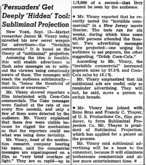 Advertising Age adlı dergide 16 Eylül 1957 tarihinde söz konusu deneye ilişkin geçilen haber metni şu şekilde: