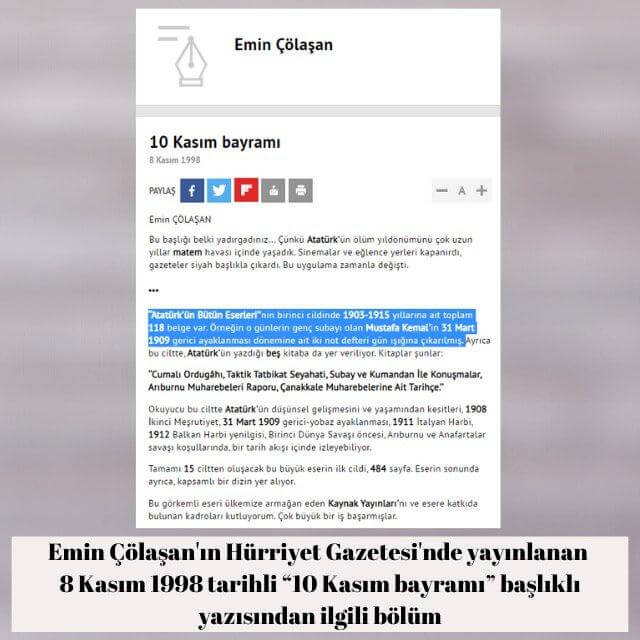 Emin Çölaşan‘ın Hürriyet Gazetesinde 8 Kasım 1998 günü yayınlanan “10 Kasım bayramı” başlıklı yazısından: