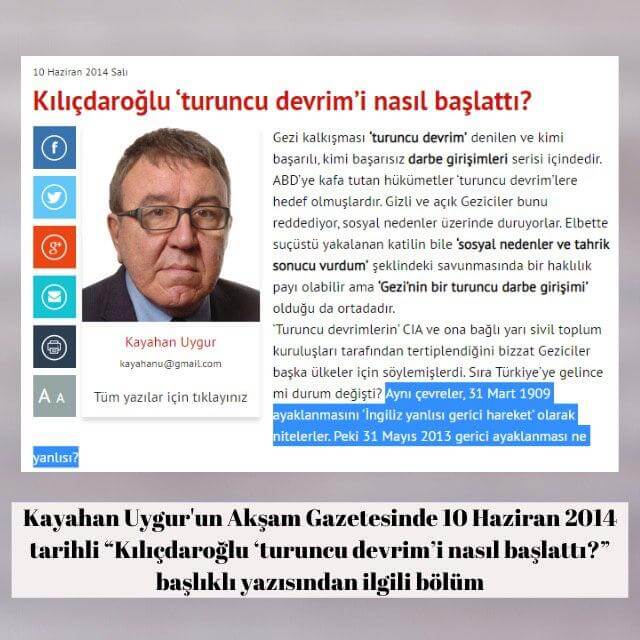 Kayahan Uygur‘un Akşam Gazetesinde 10 Haziran 2014 günü yayınlanan “Kılıçdaroğlu ‘turuncu devrim’i nasıl başlattı?” başlıklı yazısından: