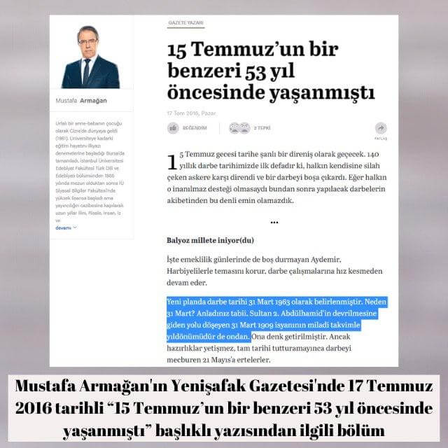 Mustafa Armağan 1963 yılındaki darbe girişiminde bulunanların kendisi gibi yanlış bilgiye sahip olduklarını iddia etmiş zımnen. 31 Mart’ın yıldönümünde darbe yapmak istemiş olsalardı miladi takvime göre 13 Nisan 1963’te yapmaları gerekirdi. Mesnetsiz bir iddia daha… (Armağan’ın, Twitter hesabından yaptığı açıklamada, “Orada söylenen 13 nişanı bilmemek değil ki, adamların şifreyi olduğu gibi kullanmaları, 13 nisanda yapsalar şifre olmayacak ki, 31 martvonemli” ifadelerini kullanarak 1963 yılındaki darbe girişiminin 31 Mart vakasına atıfla 31 Mart’a denk getirildiğini; ancak, bu şifrenin çözülememesi için Milâdi-Rumî takvim çevriminin devredışı bırakıldığını öne sürdüğü görülüyor).