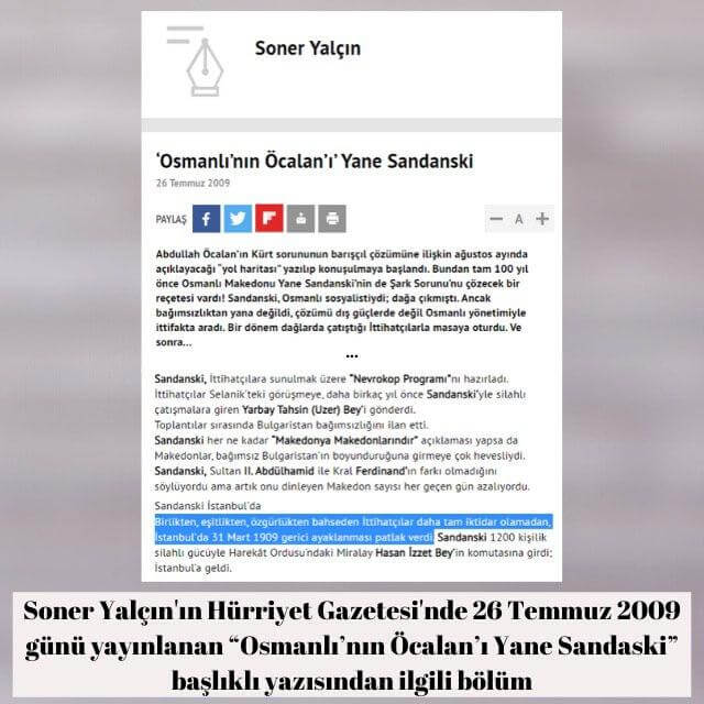 Soner Yalçın‘ın Hürriyet Gazetesinde 26 Temmuz 2009 günü yayınlanan “Osmanlı’nın Öcalan’ı Yane Sandaski” başlıklı yazısından: