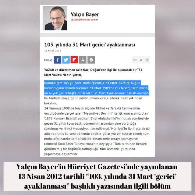 Yalçın Bayer, Hürriyet Gazetesinde yayınlanan 13 Nisan 2012 tarihli “103. yılında 31 Mart ‘gerici’ ayaklanması” başlıklı yazısında paylaştığı metindeki hatayı fark edememişti: