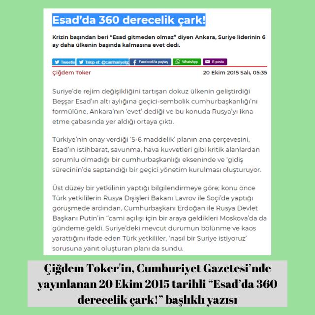 Örneğin; Çiğdem Toker, Cumhuriyet Gazetesi’nde 20 Ekim 2015 günü yayınlanan “Esad’da 360 derecelik çark!” başlıklı yazısında bu hataya düşmüş: