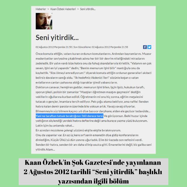 Şok Gazetesi yazarlarından Kaan Özbek, “Seni yitirdik” başlıklı 3 Ağustos 2012 tarihli yazısında geometriden çakmış: