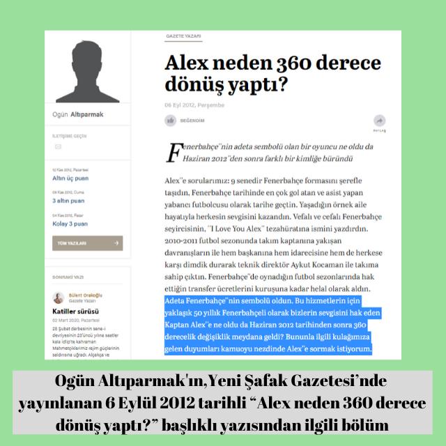 Yeni Şafak Gazetesi yazarlarından Ogün Altıparmak, 6 Eylül 2012 tarihli “Alex neden 360 derece dönüş yaptı?” başlıklı yazısında Fenerbahçe’nin eski kaptanı Alex’in dönüştüğünü iddia ederken, açılardan pek anlamadığını aşikar etmiş: