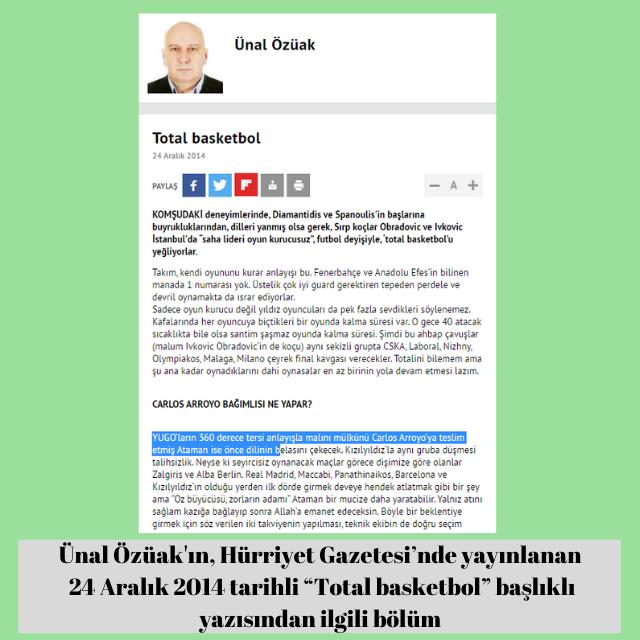 Hürriyet Gazetesi’nde basketbola ilişkin gelişmeleri aktaran Ünal Özüak, “Total basketbol” başlıklı 24 Aralık 2014 tarihli yazısında aynı hatayı yapmış: