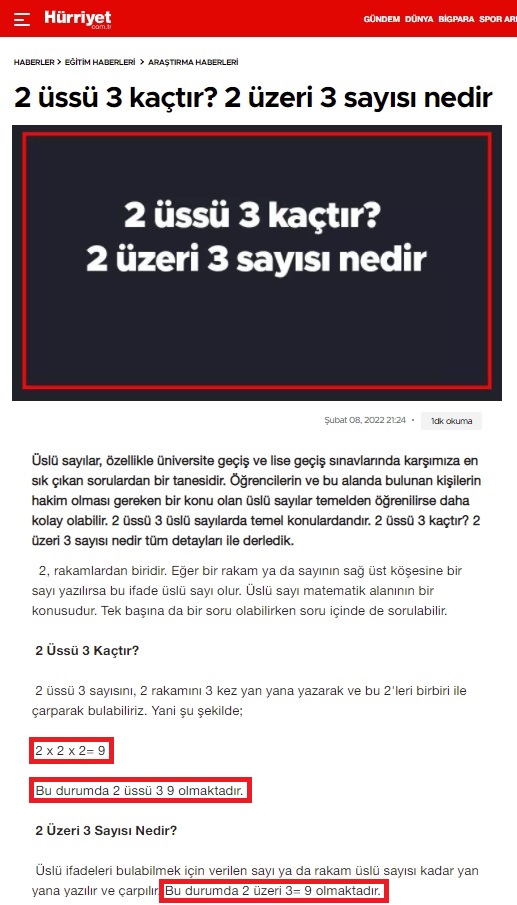 Hürriyet, interneti adeta bir çöplüğe çeviren SEO içeren yazılarından birinde 2 üssü 3’ün 9 (2 x 2 x 2 = 9) olduğunu aktarmıştı.