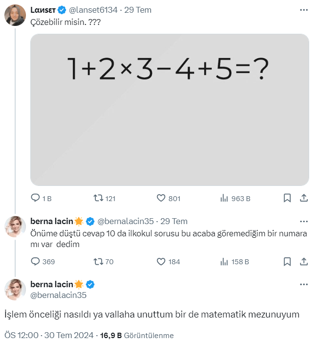 Berna Laçin, “1+2×3-4+5” sorusunu içeren tweete “Önüme düştü cevap 10 da ilkokul sorusu bu acaba göremediğim bir numara mı var dedim” yanıtını verdikten sonra gelen tepkilerin ardından “İşlem önceliği nasıldı ya vallaha unuttum bir de matematik mezunuyum” paylaşımında bulundu.