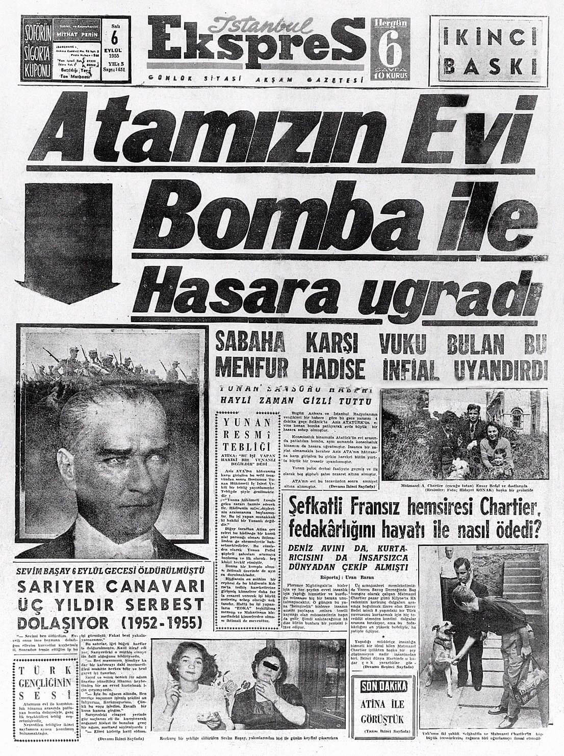İstanbul Ekspres’in 6 Eylül 1955 tarihli (ikinci baskısındaki) “Atamızın evi bomba ile hasara uğradı” manşetli, “Sabaha karşı vuku bulan bu menfur hadise infial uyandırdı” ve “Yunan sansürü haberi hayli zaman gizli tuttu” spotlu haberinde ise bombalı saldırı olduğundan farklı lanse edilerek şöyle aktarılmıştı: