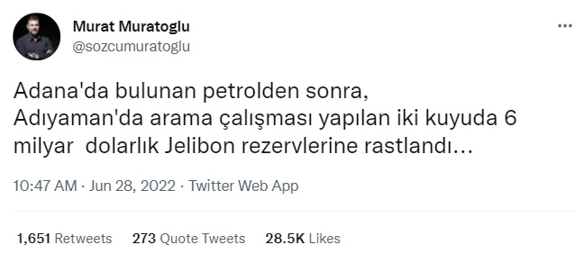 Sözcü gazetesi yazarı Murat Muratoğlu da 28 Haziran 2022 günü yeni petrol rezervi keşfi açıklamalarına göndermede bulunan bir tweet atmıştı: