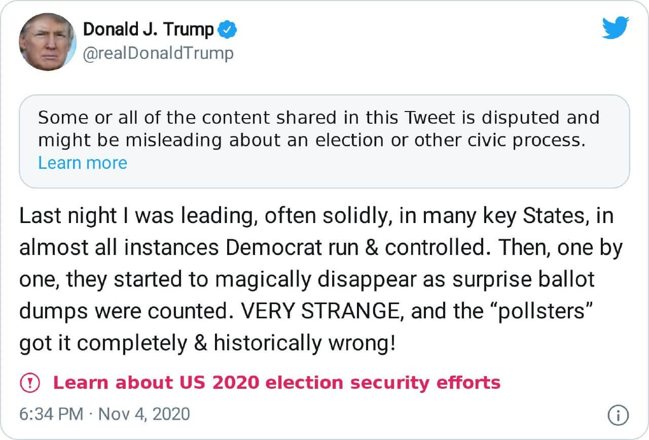 “Dün gece, çoğu önemli eyalette, Demokrat’ın yönettiği ve kontrol ettiği neredeyse tüm durumlarda, çoğu zaman sağlam bir şekilde liderlik ediyordum. Sonra sürpriz oy pusulaları sayıldıkça birer birer sihirli bir şekilde ortadan kaybolmaya başladılar. ÇOK STRANGE ve ‘anketörler’ bunu tamamen ve tarihsel olarak yanlış anladı!”