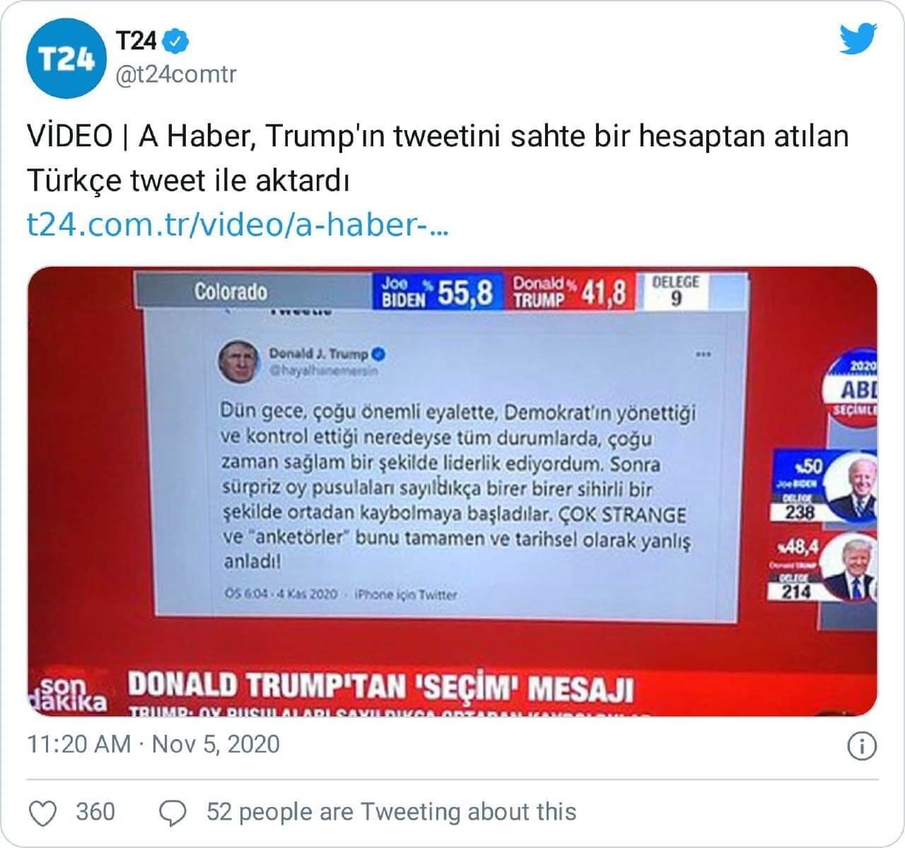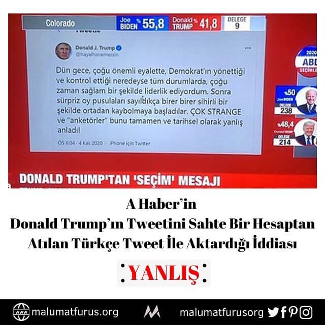 A Haber'in Donald Trump'ın tweetini sahte bir hesaptan atılan Türkçe tweet ile aktardığı iddia edilmişti.