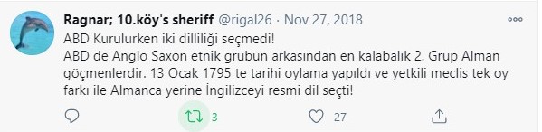 “ABD Kurulurken iki dilliliği seçmedi! ABD de Anglo Saxon etnik grubun arkasından en kalabalık 2. Grup Alman göçmenlerdir. 13 Ocak 1795 te tarihi oylama yapıldı ve yetkili meclis tek oy farkı ile Almanca yerine İngilizceyi resmi dil seçti!”
