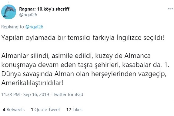 “Yapılan oylamada bir temsilci farkıyla İngilizce seçildi! Almanlar silindi, asimile edildi, kuzey de Almanca konuşmaya devam eden taşra şehirleri, kasabalar da, 1. Dünya savaşında Alman olan her şeylerinden vazgeçip, Amerikalılaştırıldılar!””