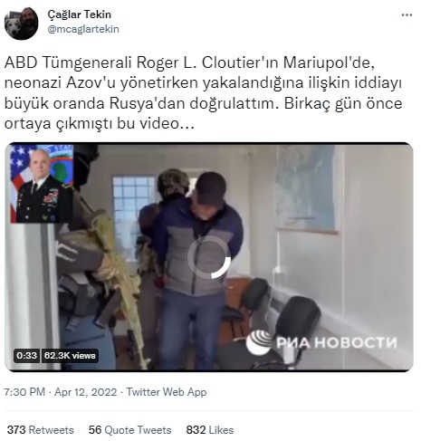 “ABD Tümgenerali Roger L. Cloutier’ın Mariupol’de, neonazi Azov’u yönetirken yakalandığına ilişkin iddiayı büyük oranda Rusya’dan doğrulattım. Birkaç gün önce ortaya çıkmıştı bu video…