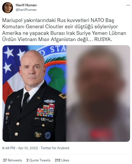 “Mariupol yakınlarındaki Rus kuvvetleri NATO Baş Komutanı General Cloutier esir düştüğü söyleniyor Amerika ne yapacak Burası Irak Suriye Yemen Lübnan Ürdün Vietnam Mısır Afganistan değil… RUSYA.”