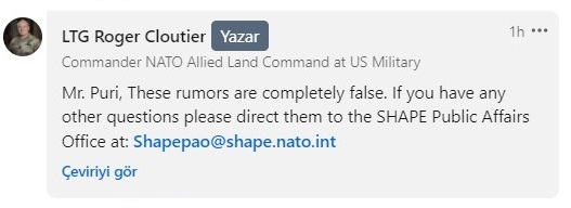 Söz konusu toplantıda General Cloutier’in konuşma yaparken ve delegelerin arasında yer alırken görüldüğü fotoğraflar NATO’ya ait resmî sosyal medya hesapları üzerinden de paylaşılmıştı.