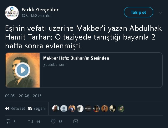 Abdulhak Hamit Tarhan gibi bir büyük şair için “erkek milletinin özeti” olduğu vurgusuyla ve “Eşinin vefatı üzerine edebiyatımızın en acı eserlerinden Makber’i yazan Abdülhak Hamit Tarhan; eşinin taziyesinde tanıştığı kadınla iki hafta sonra evlenmiştirnotuyla paylaşılan  sosyal medyada son dönemde sıklıkla paylaşılan bir iddia mevcut.