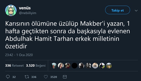 “Karısının ölümüne üzülüp Makber’i yazan, 1 hafta geçtikten sonra da başkasıyla evlenen Abdulhak Hamit Tarhan erkek milletinin özetidir”