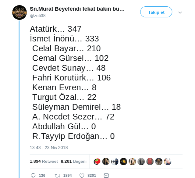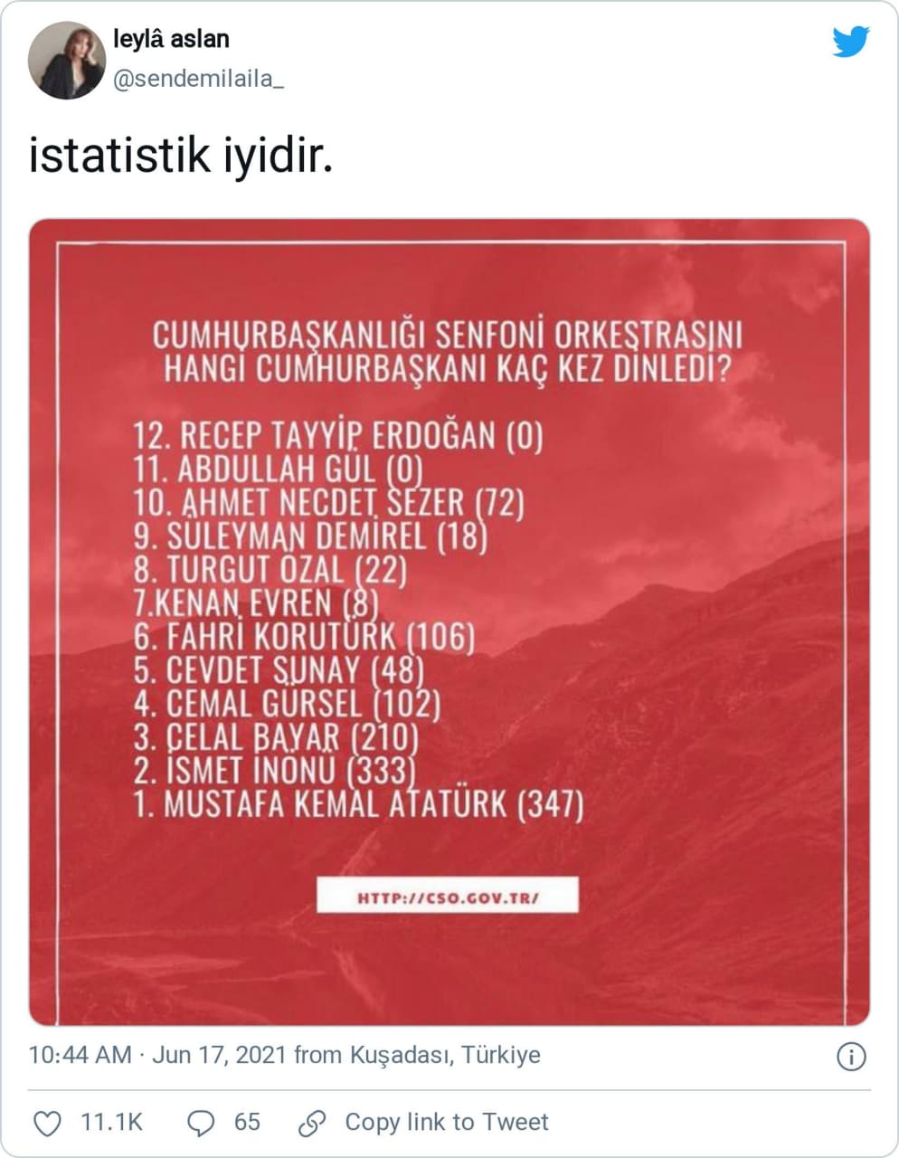 Yukarıda Türk Cumhurbaşkanlarının karşılarındaki rakamlar, Cumhurbaşkanlığı Senfoni Orkestrasını kaç kez dinlemeye gittiklerini gösteriyor…