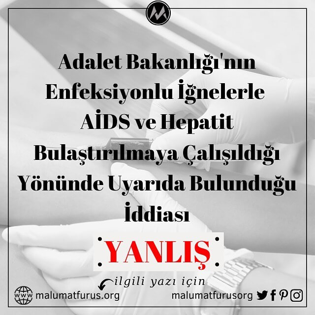 Adalet Bakanlığı’nın AIDS ve Hepatit gibi bulaşıcı hastalıkların kötü niyetli şahıslar tarafından halka iğneyle bulaştırma girişiminde bulunduklarına yönelik istihbarat aldığı ve bu yönde uyarılarda bulunduğu iddiası asılsızdır. Bu iddia bizzat Adalet Bakanlığı tarafından yalanlanmıştır. Adalet Bakanlığı Bilgi İşlem Dairesi Başkanlığı’nca hazırlandığı iddia edilerek paylaşılan uyarı yazısı başarısız bir uydurma girişimidir.