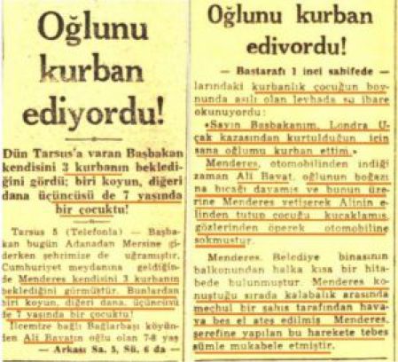 Dönemin Başbakanı Adnan Menderes’in Tarsus Mitingi sırasında Ali Bayatoğlu, Menderes’in Londra’daki uçak kazasından kurtulması dolayısıyla oğlunu kurban etmek ister. İddiaya göre, Menderes bu duruma engel olur. Oğlunu kurban etme girişimi sonrasında Milliyet Gazetesi’nden Mustafa Özkan, Ali Bayatoğlu ve oğluyla aşağıda görülen röportajı yapar.