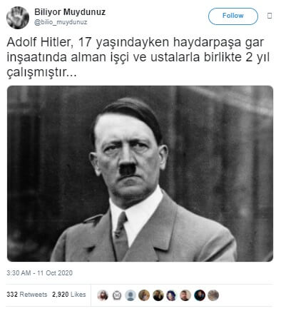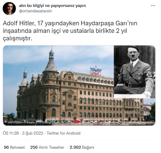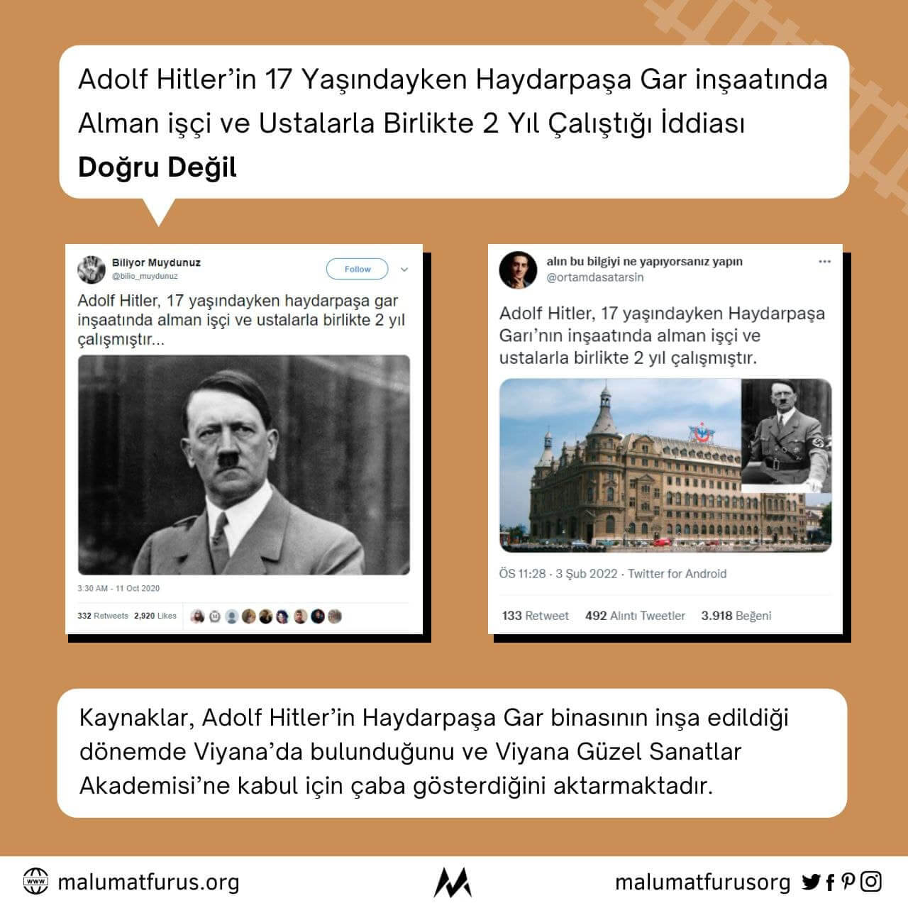 “Adolf Hitler, 17 yaşındayken Haydarpaşa Garı’nın inşaatında alman işçi ve ustalarla birlikte 2 yıl çalışmıştır.”