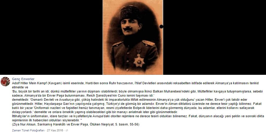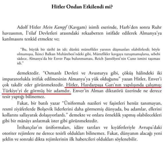 demektedir. ‘Osmanlı Devleti ve Avusturya gibi, çöküş hâlindeki iki imparatorlukla ittifak edilmesinin Almanya’ya yük olduğunu yazan Hitler, Enver’i çok takdî eder görünmektedir. Hitler, Haydarpaşa Garı’nın yapılışında çalışmış; Türkiye’yi de görmüş bir adamdır. Enver’in Alman diktatörü üzerinde ne derece tesir yaptığı bilinemez.”