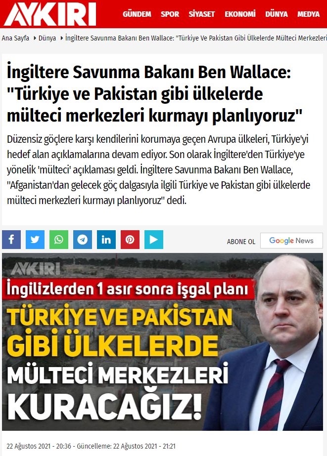 İngiltere Savunma Bakanı Ben Wallace’ın Türkiye ve Pakistan gibi ülkelerde Afganlar için mülteci merkezleri planladığı iddiası son günlerde basında ve sosyal medyada kendine yer bulmuştu. Her ne kadar İngiltere Savunma Bakanı makalesinde doğrudan Türkiye’yi zikretmese de İngiliz basını yayımladıkları haberlerde söz konusu ülkeler arasında Türkiye ve Pakistan’ın da yer aldığını aktarmıştı.