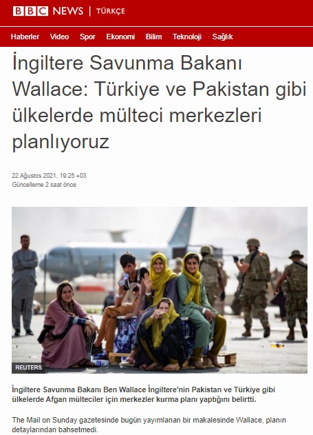 Bu haberde Savunma Bakanı’nın sözlerine ek olarak, İngiltere Savunma Bakanlığına atfen Afgan mülteciler için geçici işlem merkezleri kurulması amacıyla Türkiye ve Pakistan’ın düşünüldüğü de belirtilmiştir.