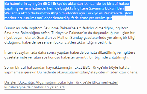 Bu haberlerin aynı gün BBC Türkçe‘de aktarılan ilk halinde ise bir atıf hatası yapılmış ve hem haberde, hem de başlıkta İngiltere Savunma Bakanı Ben Wallace’a atfen “hükümetin Afgan mülteciler için Türkiye ve Pakistan’da işlem merkezleri kurulmasını” değerlendirdiği ifadelerine yer verilmiştir.