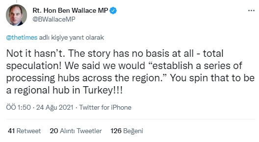 İngiltere Savunma Bakanı Ben Wallace, sosyal medya hesabından yaptığı bir paylaşımda söz konusu iddia ile ilgili “Hayır, haberin bir temeli yok, tamamen spekülasyon! Bölge genelinde bir dizi işleme merkezi kuracağımızı söyledik. Bunu bölgesel merkezin Türkiye’de olacağı şekline çevirdiniz.” ifadelerini kullanmıştı.